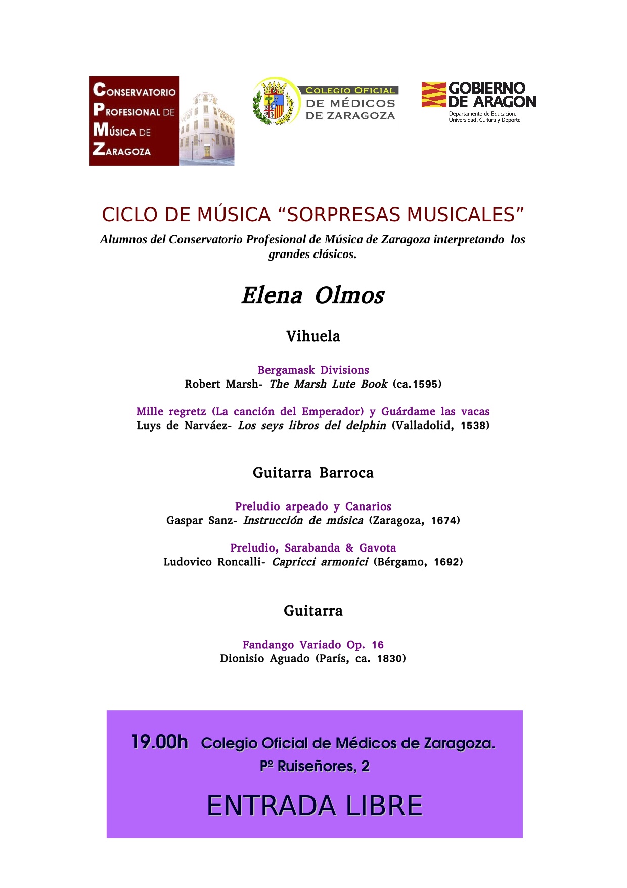 El martes 18, a las 19:00, habrá un concierto a cargo de Elena Olmos (guitarra barroca) en el Colegio de Médicos, dentro del ciclo «Sorpresas Musicales.» La entrada es libre hasta completar el aforo.