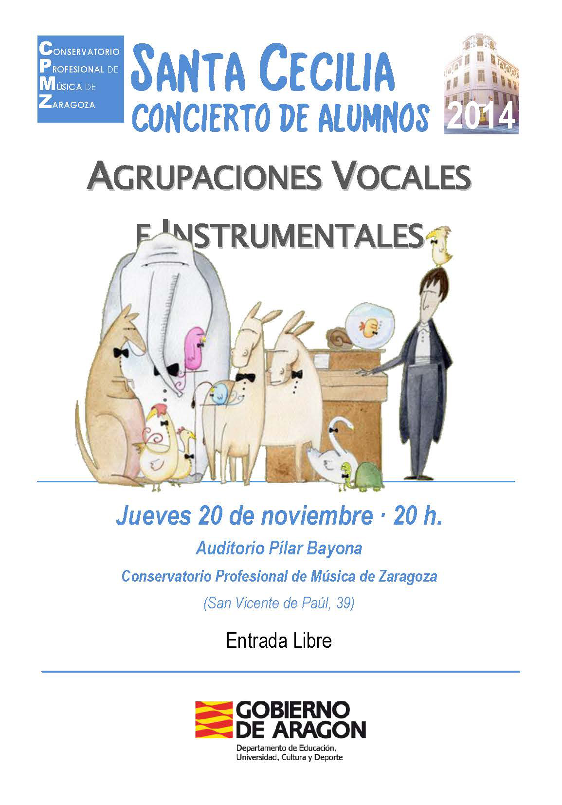 El jueves, 20 de noviembre de 2014, a las 20 horas, en el Auditorio “Pilar Bayona” del Conservatorio Profesional de Música de Zaragoza, tendrá lugar el Concierto de Agrupaciones del conservatorio, enmarcado en los actos de Sta. Cecilia que se están desarrollando a lo largo de la semana del 17 al 21 de noviembre.