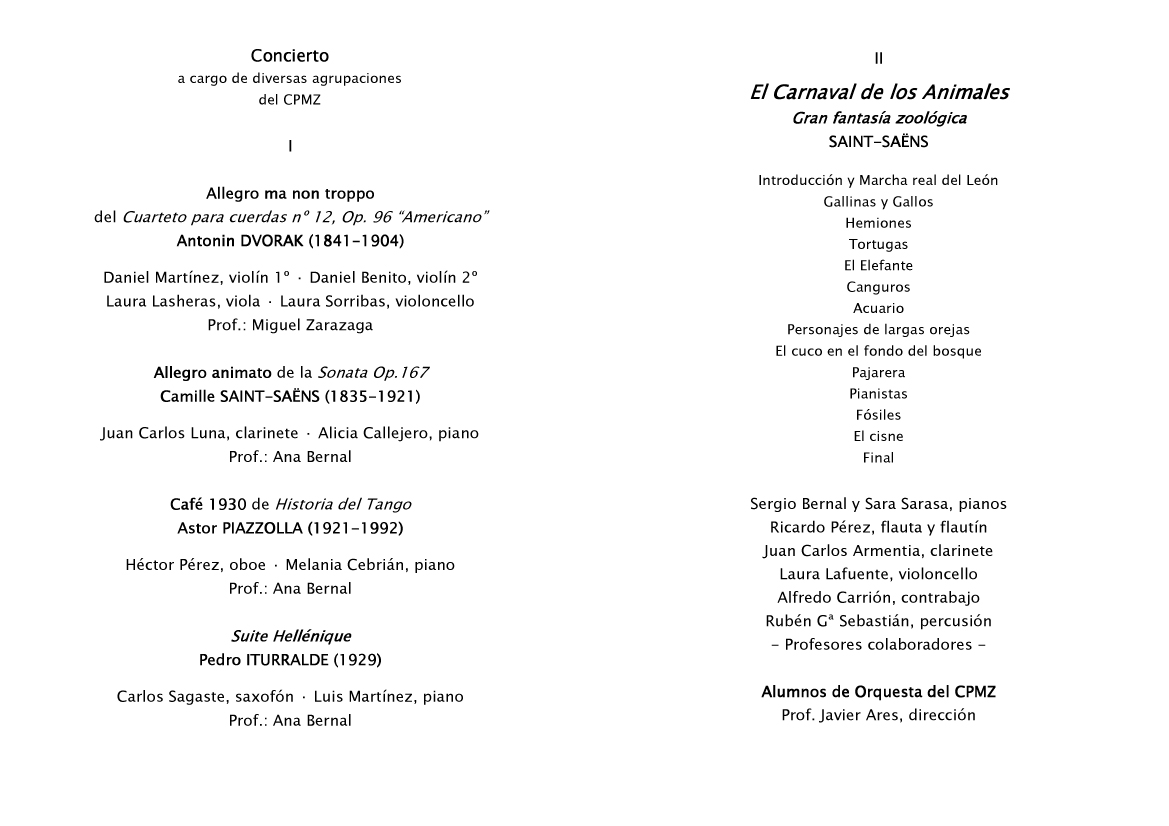 En la primera parte podrán escucharse a cuatro agrupaciones de Música de Cámara, formadas por alumnos del centro y que interpretarán obras de Dvorak y Piazzolla entre otros. A continuación, en la segunda parte, la orquesta de alumnos del centro, con la colaboración de varios profesores del centro, interpretará el conocido Carnaval de los animales, de C. Saint-Saëns. La entrada a este acto es libre hasta completar el aforo.