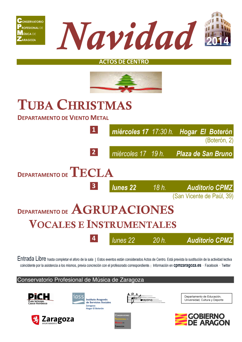 A las 17:30, Tuba Christmas (Departamento de Viento Metal) en Hogar el Boterón y a las 19:00, en la Pza. S. Bruno.