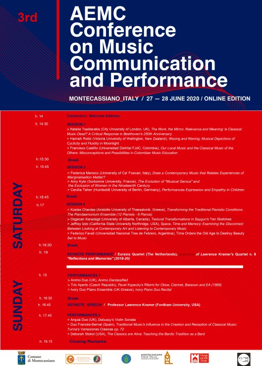 El próximo fin de semana del 27 y 28 de junio tendrá lugar la 3rd Academic Conference on Music, Communication and Performance, un encuentro cuya celebración estaba prevista en la localidad italiana de Montecassiano, pero que debido a la pandemina del Covid19 se desarrollará online, en las mismas fechas. Se promueve así la investigación interdisciplinaria y los enfoques originales en cualquier campo de la musicología, sociología, filosofía, literatura, etc, y en cualquier campo de actuación artística que involucre la música. Esta tercera edición se centrará en la pregunta: ¿está muerta la música clásica? Cuestión de Kramer reexaminada (Conferencia magistral: Prof. Lawrence Kramer).