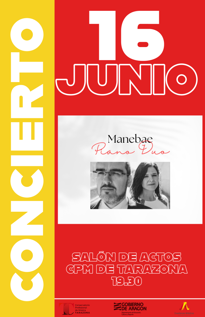 El próximo viernes, 16 de junio, Manebae Piano Dúo actuará en el Salón de Actos del Conservatorio Profesional de Música de Tarazona, presentando uno de los programas de concierto sobre la Jota que tienen en su repertorio. El acto comenzará a las 19:30. La entrada es libre hasta completar el aforo.