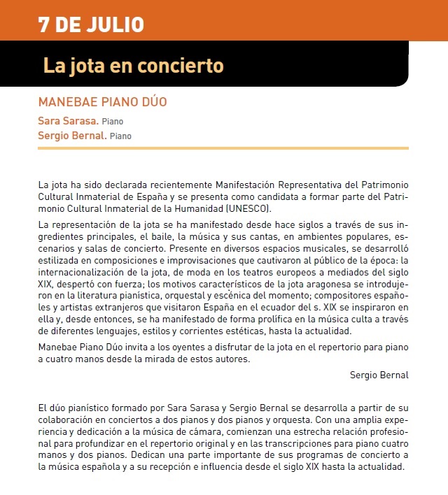 7 de julio, AAIM, Albéniz, Chabrier, Concierto, Debussy, Foro Romano, Gevaert, Glinka, Gottschalk, Jota, Jota aragonesa, La Jota en Concierto, Manebae Piano Duo, Montsalvatge, Patrimonio Cultural Inmaterial de la Humanidad, Ravel, Sara Sarasa, Sergio Bernal, Stravinsky, UNESCO, Zaragoza