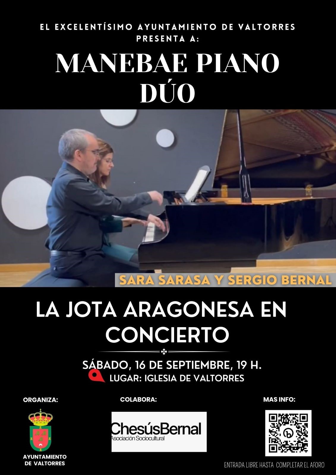El próximo sábado, 16 de septiembre, Manebae Piano Dúo actuará en la Iglesia de Valtorres, interpretando un programa de concierto sobre la Jota aragonesa. Los pianistas Sara Sarasa y Sergio Bernal interpretarán un variado repertorio para piano a cuatro manos, con piezas de Moszkowski, Fauré, Glazunov o Falla, entre otros. Bernal comentará algunos aspectos de la Jota aragonesa y la música culta.